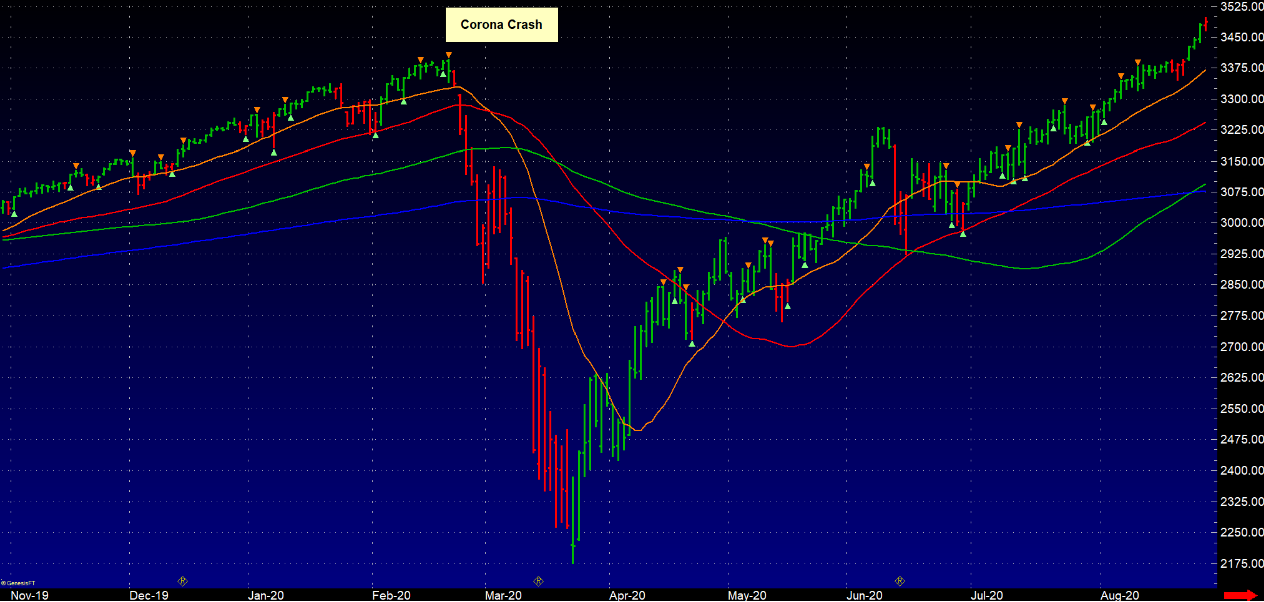 The market remained strong until February 20, 2020, when the S&P500 Indicator signaled a bearish impulse. This was immediately followed by the first red daily candle. Traders who acted on this signal could have exited the market with minimal losses before the major sell-off began. On April 23, the first green signal appeared. Entering the market immediately after this signal would have meant buying at the absolute bottom and participating in one of the strongest rallies in market history.