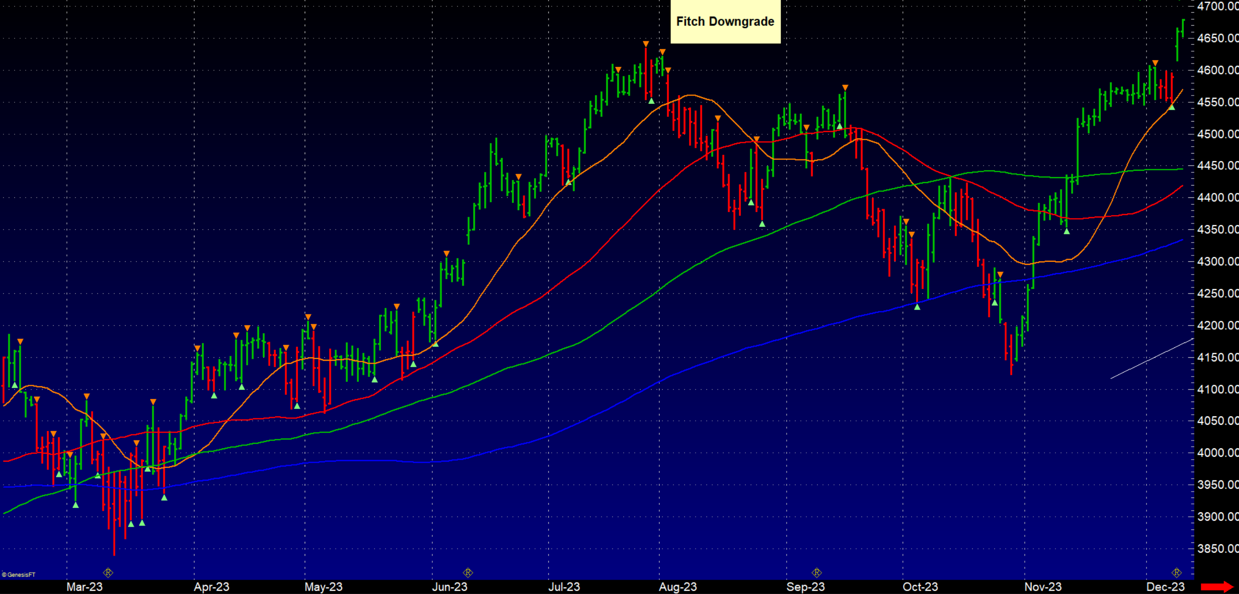 The market began topping out several days before the Fitch downgrade was officially announced. The S&P500 Indicator turned red, registering multiple consecutive bearish impulses—a clear warning signal well before Fitch made its public statement. Following the downgrade, another shift to red occurred, accompanied by an additional bearish impulse. The market then moved lower in three distinct waves, with the Indicator reliably signaling key highs and lows throughout the decline.