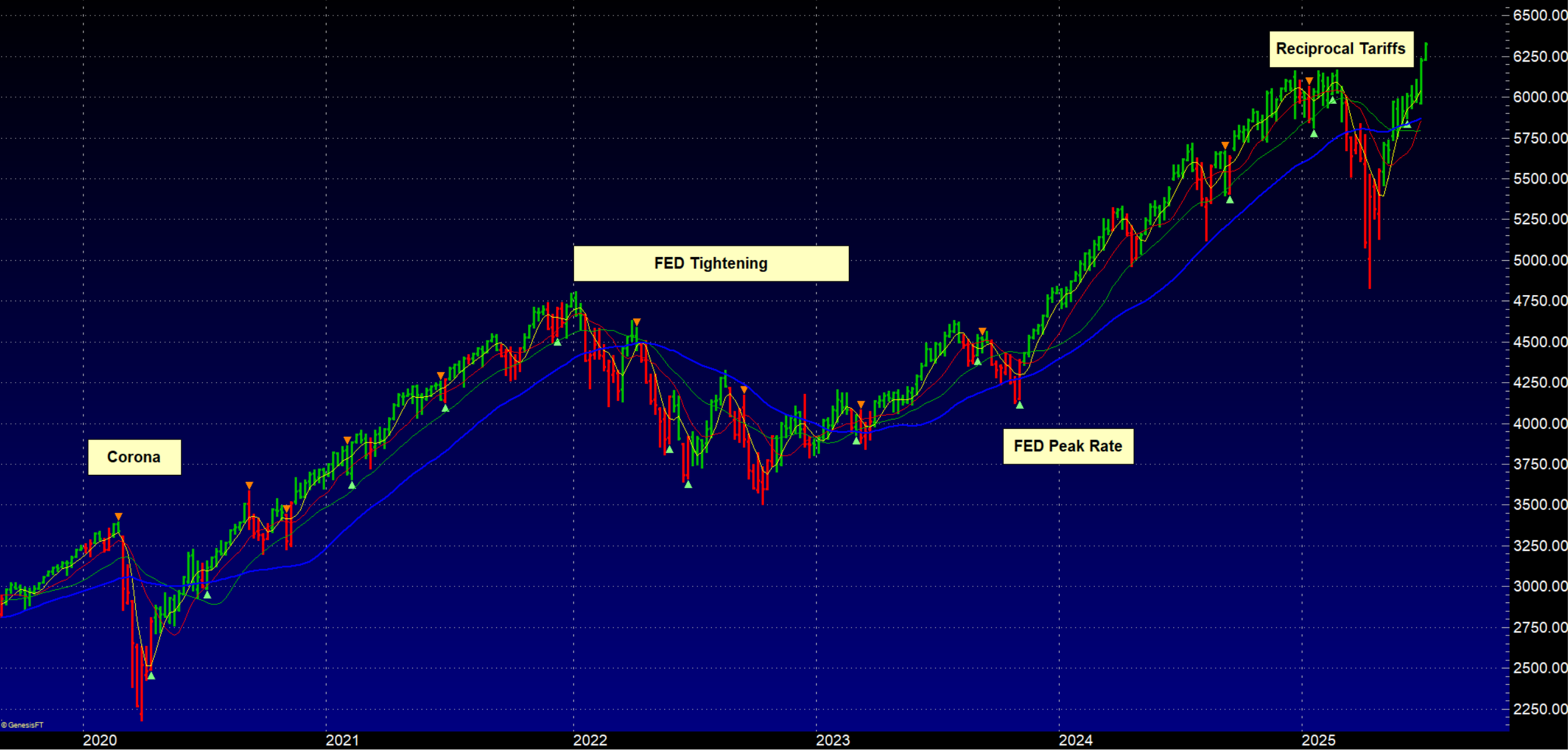 A significant market sell-off was triggered by President Trump's announcement of reciprocal tariffs in February 2025. The decline unfolded in two waves. At the low in April, an unexpected announcement postponed the implementation of these tariffs by 90 days. Following this news, the S&P500 Indicator detected a three-day period of accumulation before a major rally commenced, culminating in a strong V-shaped recovery.